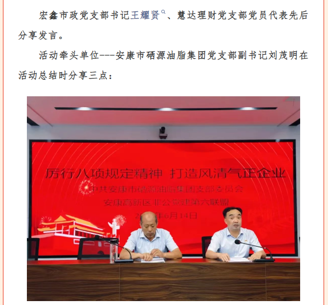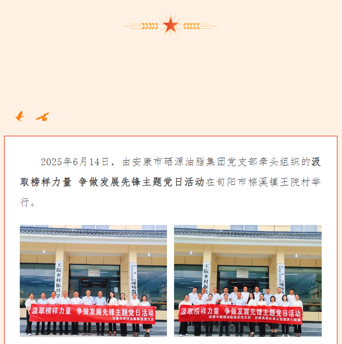 | 安康市硒源油脂集團(tuán)黨支部組織開(kāi)展汲取榜樣力量 爭(zhēng)做發(fā)展先鋒主題黨日活動(dòng) |